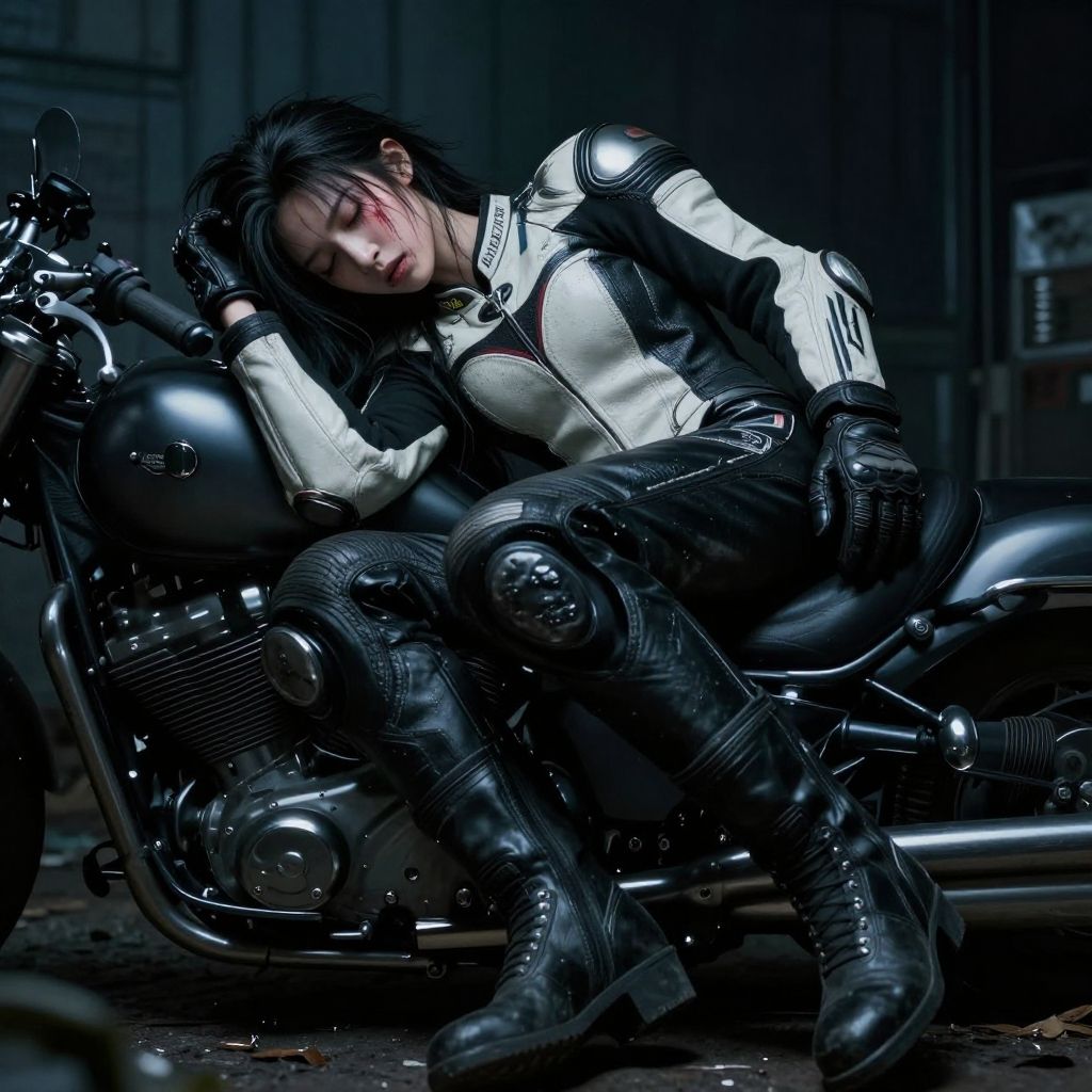 Photograph-style digital art of a weary, black-haired woman in black and white leather biker gear, asleep on a sleek, black motorcycle in a