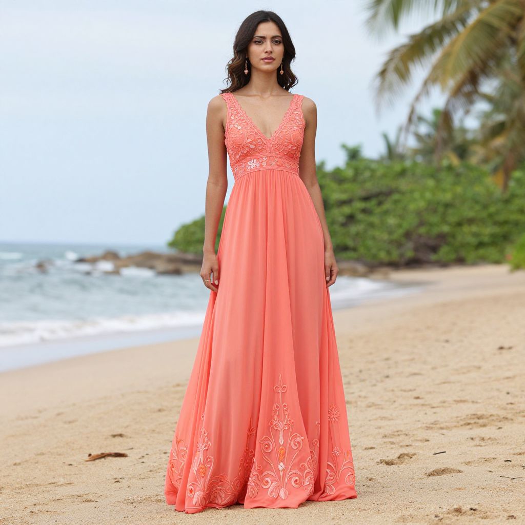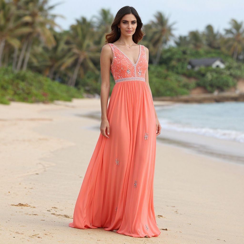 Photograph of a young woman standing on a sandy beach with palm trees in the background. She has wavy brown hair and is wearing a floor-length, coral-pink evening gown with a deep V-neckline adorned with intricate white beadwork. The gown's skirt is flowing and slightly sheer, with small white floral embellishments. The beach has light-colored sand and a calm, blue ocean on the right. The woman has a fair skin tone and a neutral expression, standing confidently with her arms relaxed by her sides. The background is slightly blurred, emphasizing the subject.