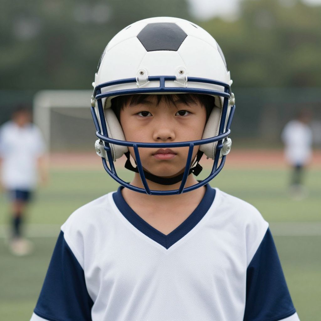 Photograph of an Asian boy wearing a white and navy football helmet and jersey, standing on a blurred soccer field.