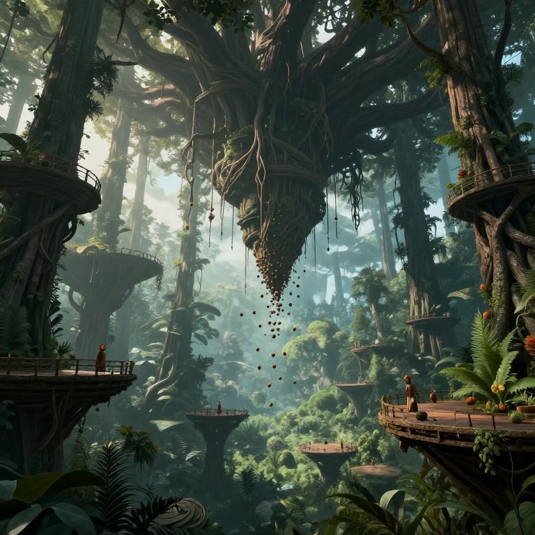 An ancient forest where trees grow upside down with roots in the sky, and fruit falls upward into floating platforms.