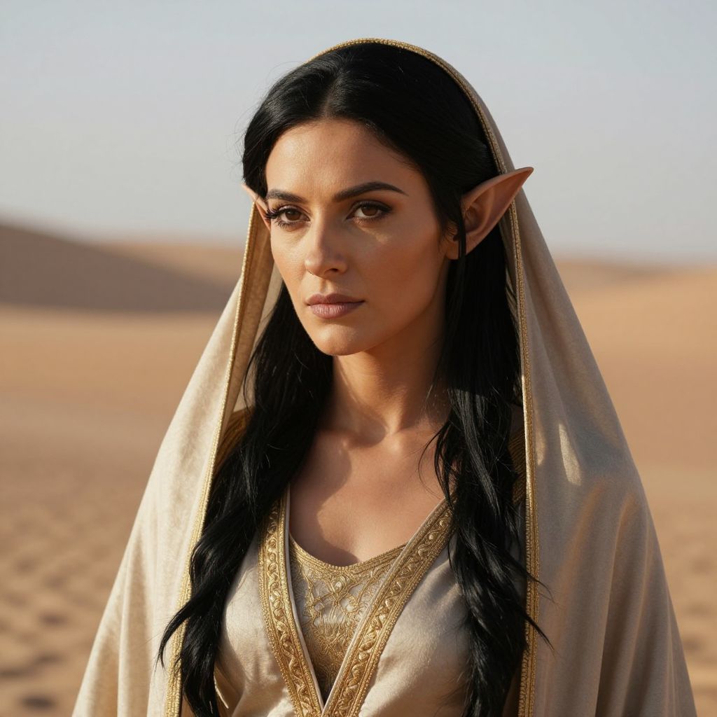 Photorealistic CGI of an elven woman with long black hair, pointed ears, and a gold-trimmed beige robe, standing in a desert