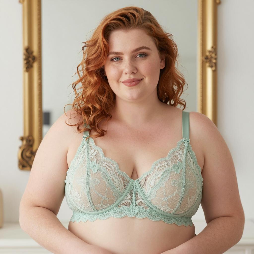 A photo of a plus-sized woman with light skin and long brown hair. She wears a light purple lace bra, exposing her large breasts. She has a neutral expression. The background features a leopard print fabric. She is centered, looking directly at the camera.