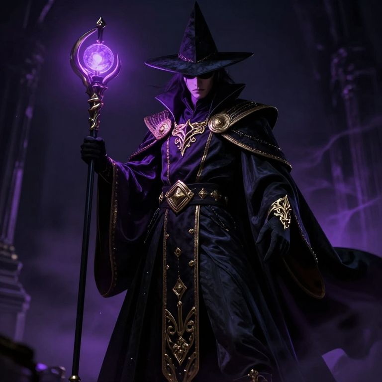 In this captivating image, a mysterious figure stands resolutely, exuding an aura of power and enigma. Dressed in dark robes adorned with intricate golden embellishments, the character's attire is a striking contrast to the somber palette. The pointed hat, a symbol of authority and mystery, casts a shadow over the face, adding to the enigmatic quality. The staff, a symbol of command and control, is held firmly in one hand, its top adorned with a glowing purple orb that emits a soft, ethereal light. The other hand is wrapped around a similarly ornate glove, suggesting a readiness for action. The background is shrouded in darkness, with dynamic lighting that highlights the figure's form, creating a dramatic and cinematic effect. The overall composition is balanced, with the character centrally positioned, drawing the viewer's eye to the intricate details of the robes and the staff. The image is a masterful blend of dark and purple hues, with the golden accents providing a subtle yet significant contrast. The character's pose, with one leg slightly forward, adds a sense of movement and anticipation, as if poised for a decisive action. The entire scene is a testament to the artistry and skill of the artist, capturing the essence of a powerful and enigmatic figure in a dynamic and visually striking manner.