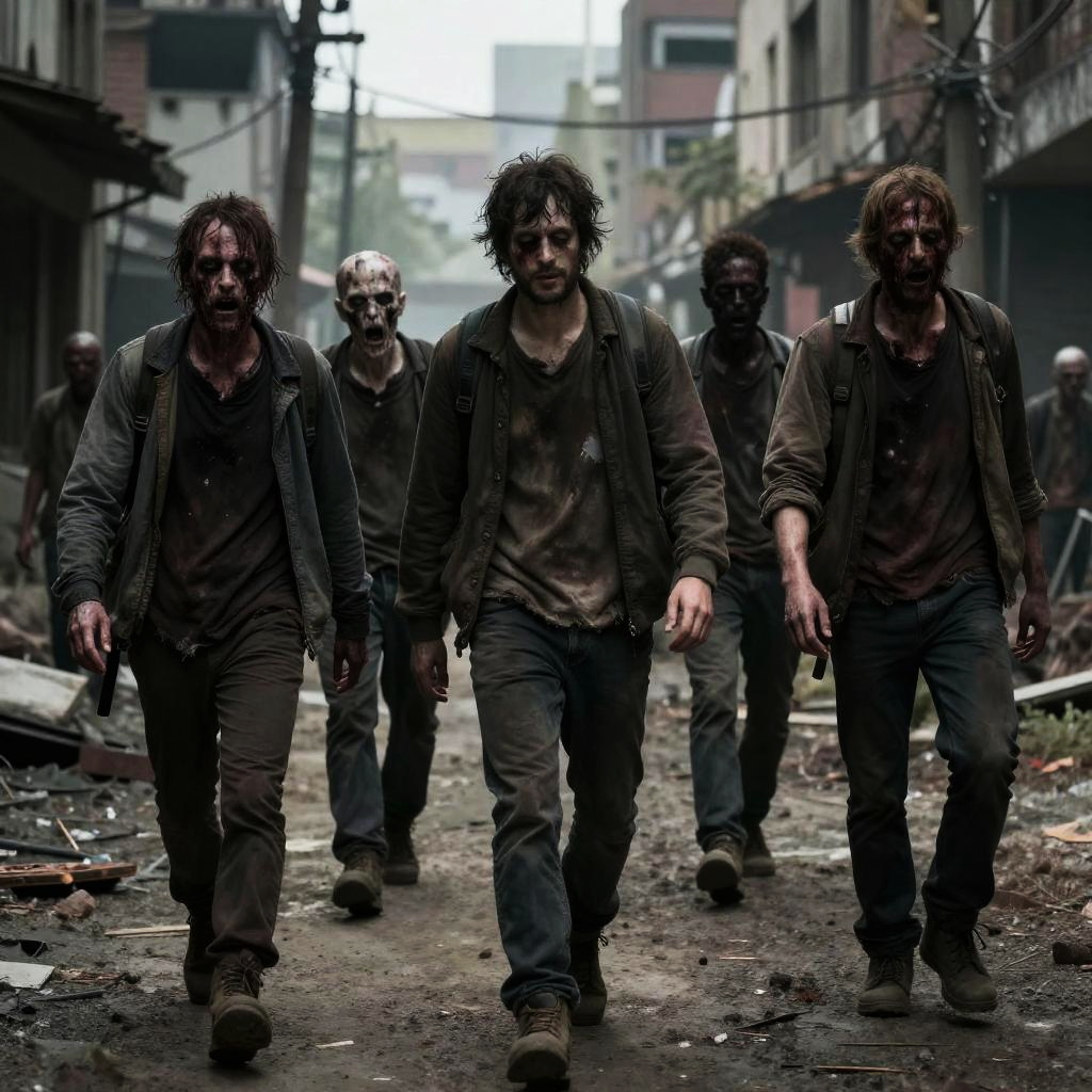 The walking dead 4k, intense survivor group exploring desolate urban ruins, gritty and dark atmosphere, detailed zombie horde in background, realistic facial expressions, tattered clothing, dramatic shadows, high detail environment, cinematic post-apocalypse scene.