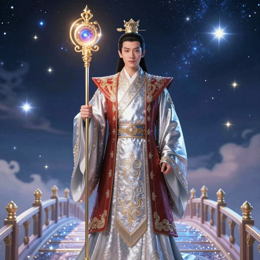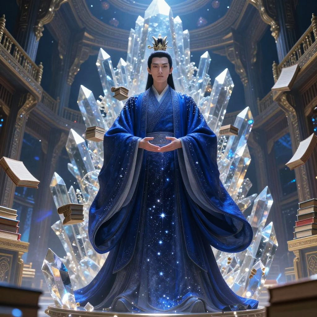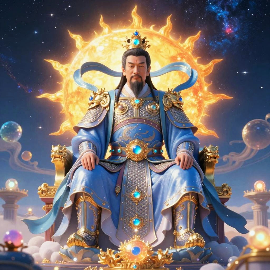 Yu Huang (Jade Emperor) – Supreme ruler of heaven, depicted as a serene deity illuminated by soft amethyst robes, embodying peace and celestial balance, set in an enchanted lavender grotto filled with radiant quartz crystals and flowing starlit waters.