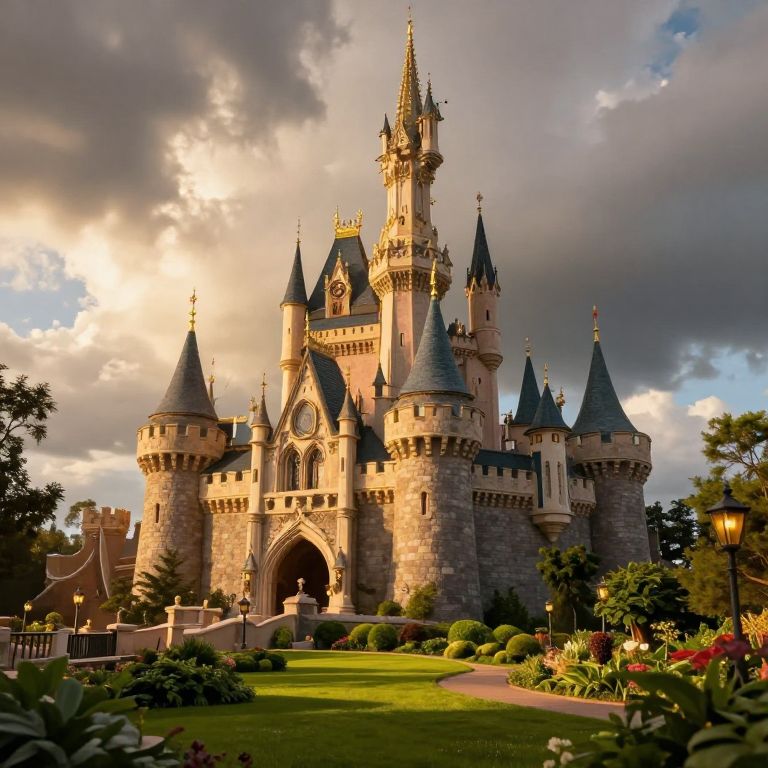 The image depicts a whimsical, cartoon-style castle with a Scottish influence, set against a dramatic, cloudy sky. The castle features multiple towers, including a prominent, tall, pointed tower with a clock face, and several smaller, ornate structures. The architecture is detailed with pointed arches, intricate stonework, and a variety of roof shapes, including steeply pitched roofs and gables. The castle is surrounded by a lush, green landscape with a mix of trees, bushes, and a well-manicured lawn. The scene is illuminated by warm, golden light, creating a cozy and inviting atmosphere. Street lamps line the path leading up to the castle, adding to the enchanting ambiance. The overall composition is balanced, with the castle centrally positioned and the surrounding elements arranged to frame it beautifully. The interplay of colors, textures, and shapes creates a rich, immersive environment that feels both fantastical and grounded in a familiar, magical world.