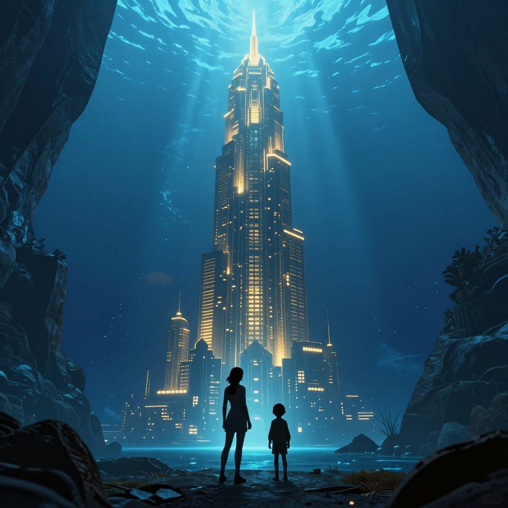 In a cyberpunk-inspired 3D-rendered scene, a towering bioluminescent skyscraper rises majestically from the ocean floor, its golden lights piercing the deep blue waters as two figures—a woman and a child—stand in awe, their silhouettes framed by rugged underwater cliffs, evoking a futuristic vision of life beneath the sea.