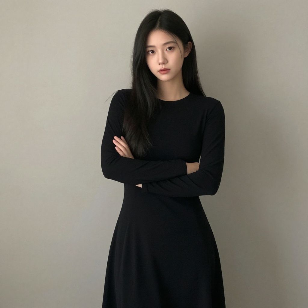 A photograph of an East Asian woman with long, straight black hair and fair skin, standing against a plain, light grey background. She wears a simple, long-sleeved, black dress that fits her slender frame. She stands with arms crossed over her chest, giving a neutral, slightly serious expression. The lighting is soft, highlighting her delicate features and the smooth texture of her dress. The overall style is minimalist and contemporary, focusing on her elegant and composed presence.