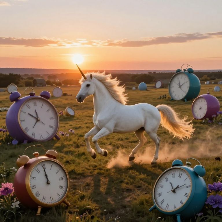 Picture an extraordinary landscape, akin to surrealistic visions, with timepieces resembling melting wax adorning gnarled, twisted trees from a bird's eye view. Amidst this fantastical realm, a regal mythical creature reclines upon a carpet of vibrant, shimmering blossoms, its luminous horn casting gentle light under the uncanny glow of dual sunsets. This captivating fusion of fantasy and surrealism is characterized by vivid hues and an enigmatic atmosphere, inviting viewers to marvel at the wonders it holds.