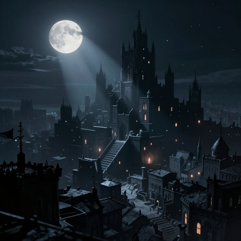 Nighttime cityscape of Gothic architecture illuminated by a bright, full moon casting beams over a staircase, with scattered lights and shadows.