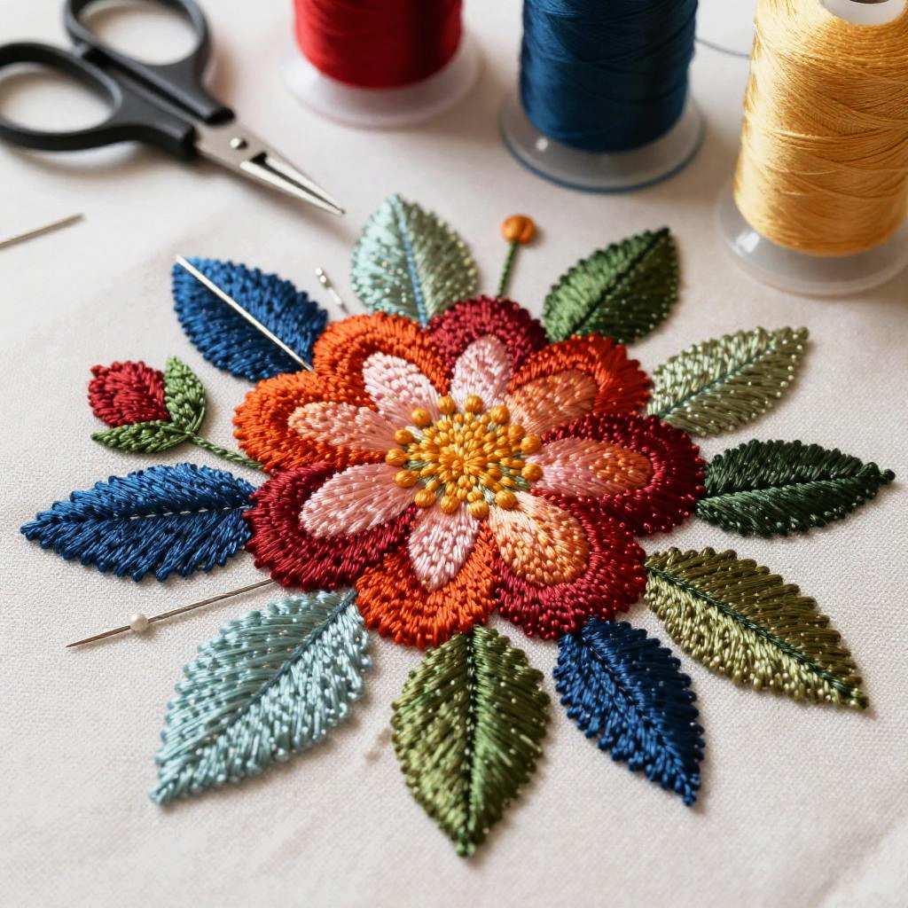 Macro shot of an embroidery pattern maker's detailed floral design, vibrant threads creating textured petals and leaves with exquisite precision, set against a background of creative tools like needles, scissors, and thread spools, rich colors and high detail.