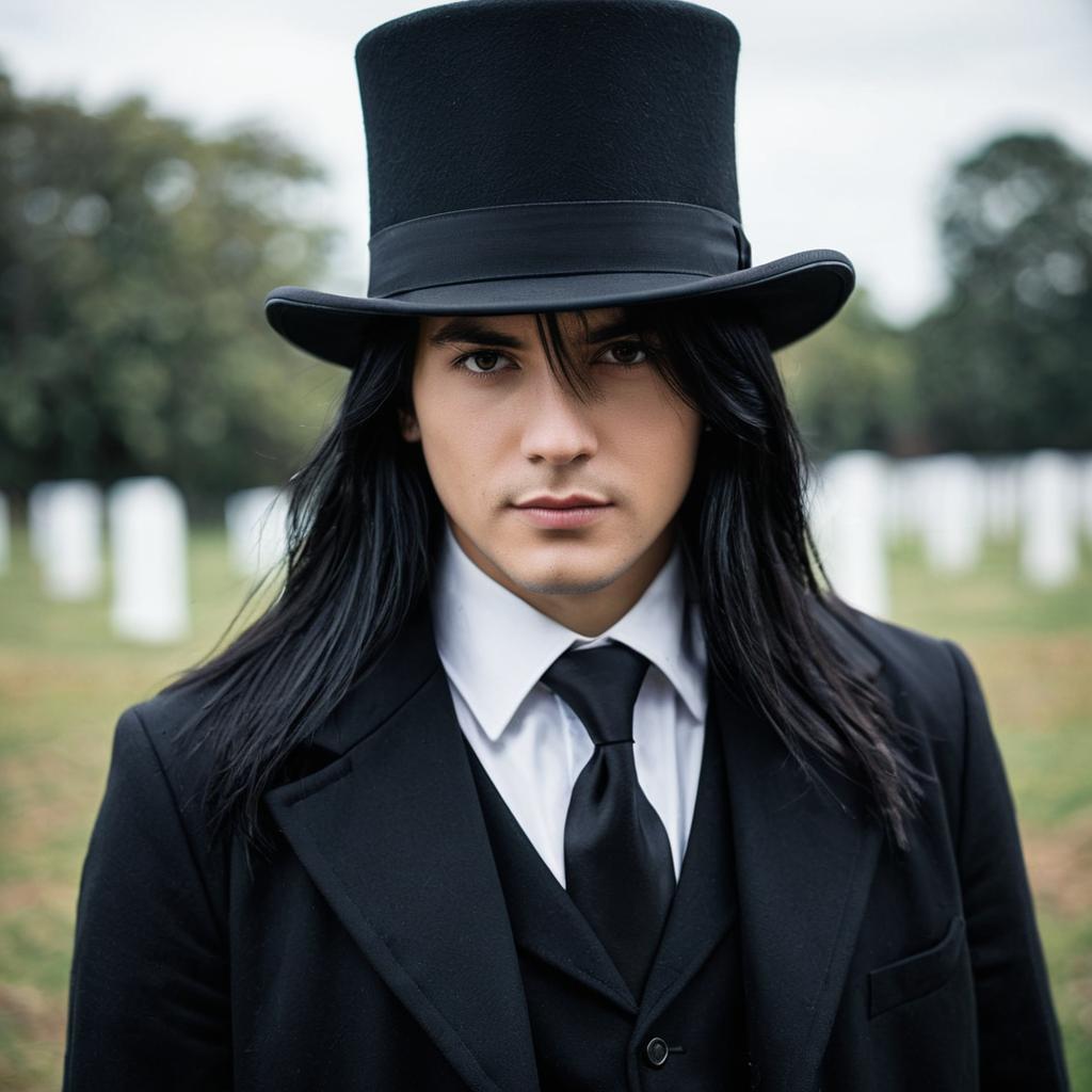 Portrait of a young man with long black hair wearing a black top hat, black jacket, white collared shirt, and black necktie. He is outdoors in a blurred background that appears to be a cemetery, with gravestones faintly visible. The image has a realistic style and the subject is looking directly at the camera.
