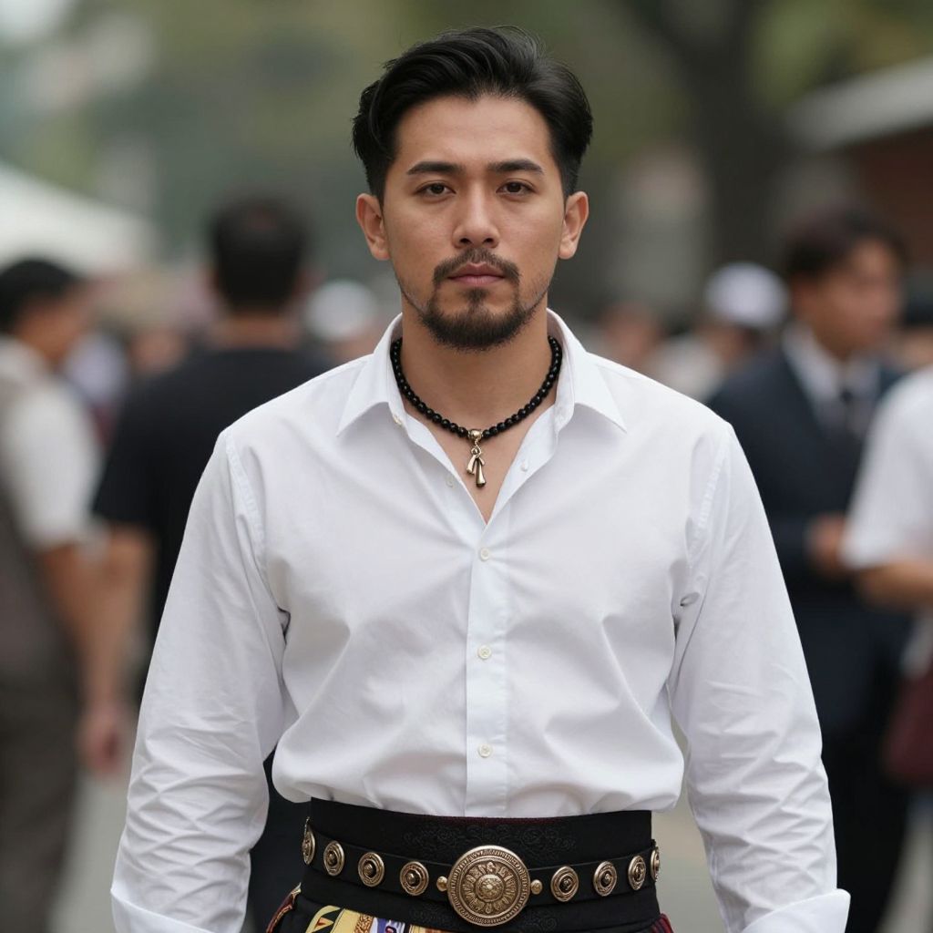Photograph of an Asian man with a medium build, short black hair, and a trimmed beard, standing outdoors in a blurred crowd. He wears a crisp white button-up shirt with a black necklace, and a black belt with a gold ornate buckle. His expression is neutral, and the background includes indistinct people and greenery. The man's attire and necklace add a touch of traditional style, while the background suggests a public or cultural event. The image has a shallow depth of field, focusing on the man while blurring the background.