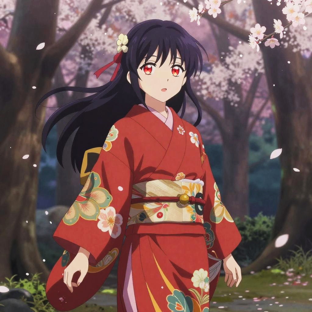 Anime-style illustration of a young girl with long black hair, red eyes, and red floral kimono, standing in a cherry blossom forest with petals falling