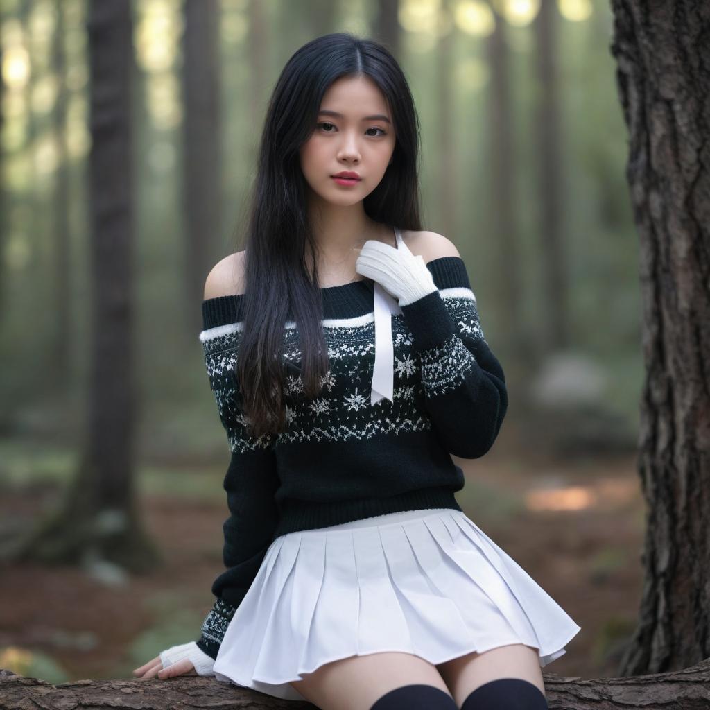 Portrait of an Asian young woman with long black hair sitting on a log in a forest. She is wearing a black and white patterned off-shoulder sweater, white pleated skirt, black thigh-high socks, and white fingerless gloves. The background shows tall trees and a soft natural light, creating a peaceful outdoor atmosphere.
