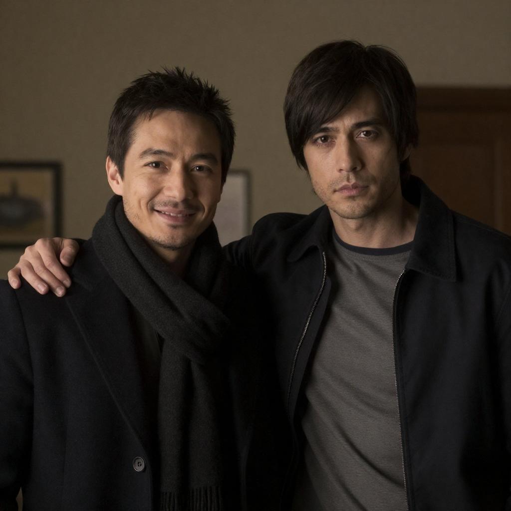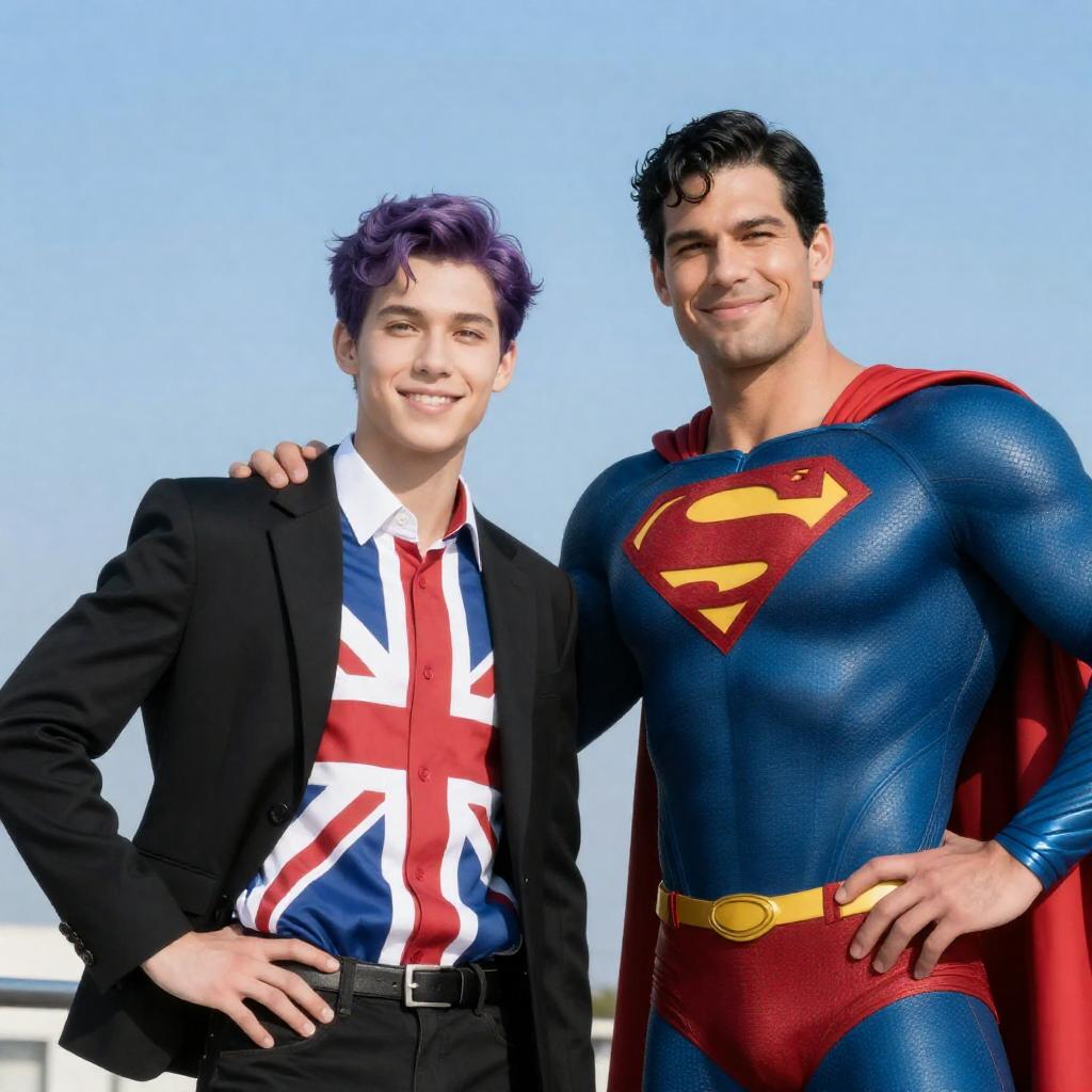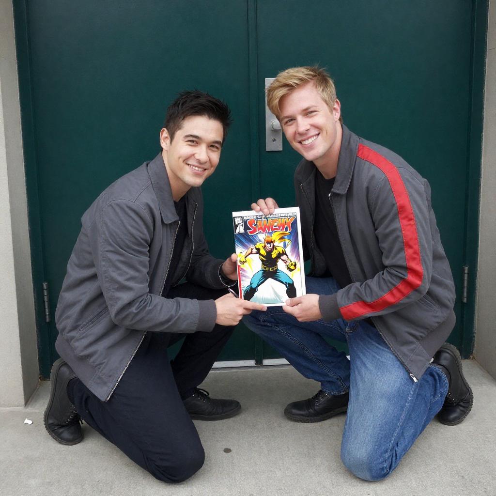 Photograph of two men kneeling on a concrete floor in front of a green door. The man on the left, with short dark hair and a gray jacket, signs a comic book. The man on the right, with blond hair and a gray jacket with red stripes, holds a white bag with a comic book cover. Both men are smiling.