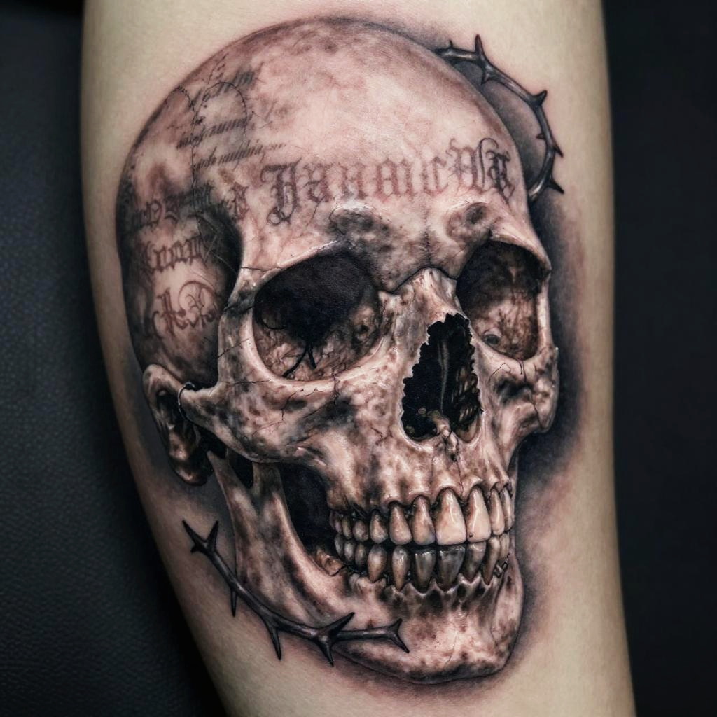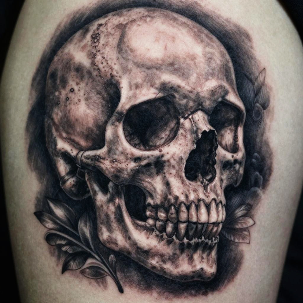 Realistic skull tattoo design in black and gray, showing cracked surfaces and deep eye sockets, surrounded by gothic roses and subtle smoke effects for a dramatic look.