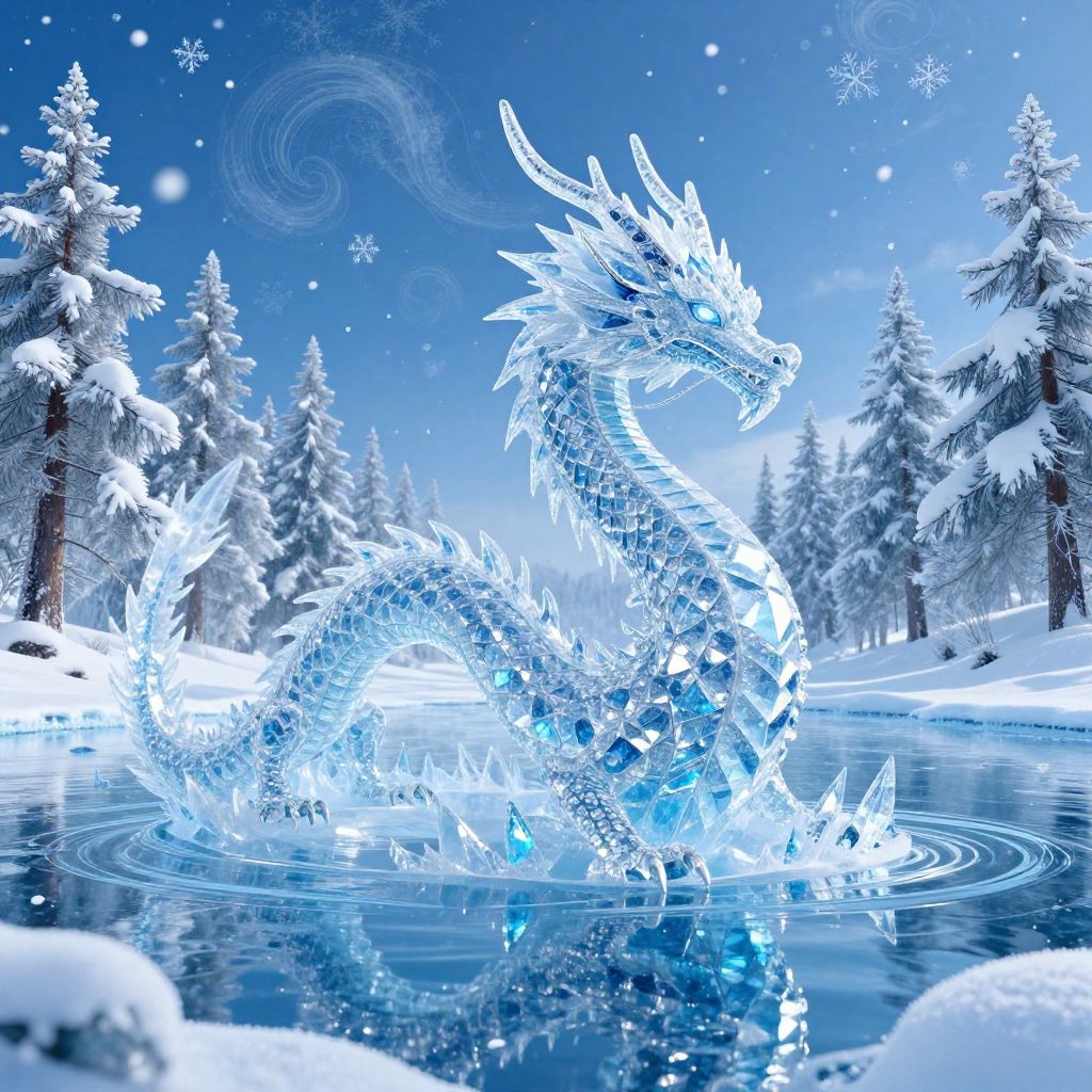Ice dragon art featuring a serene frozen lake where an elegant dragon made of crystal ice rises from the water, frost sparkling on its elongated body, surrounded by snow-covered pines and swirling snowflakes, rendered with vibrant blue and white hues and magical realism.