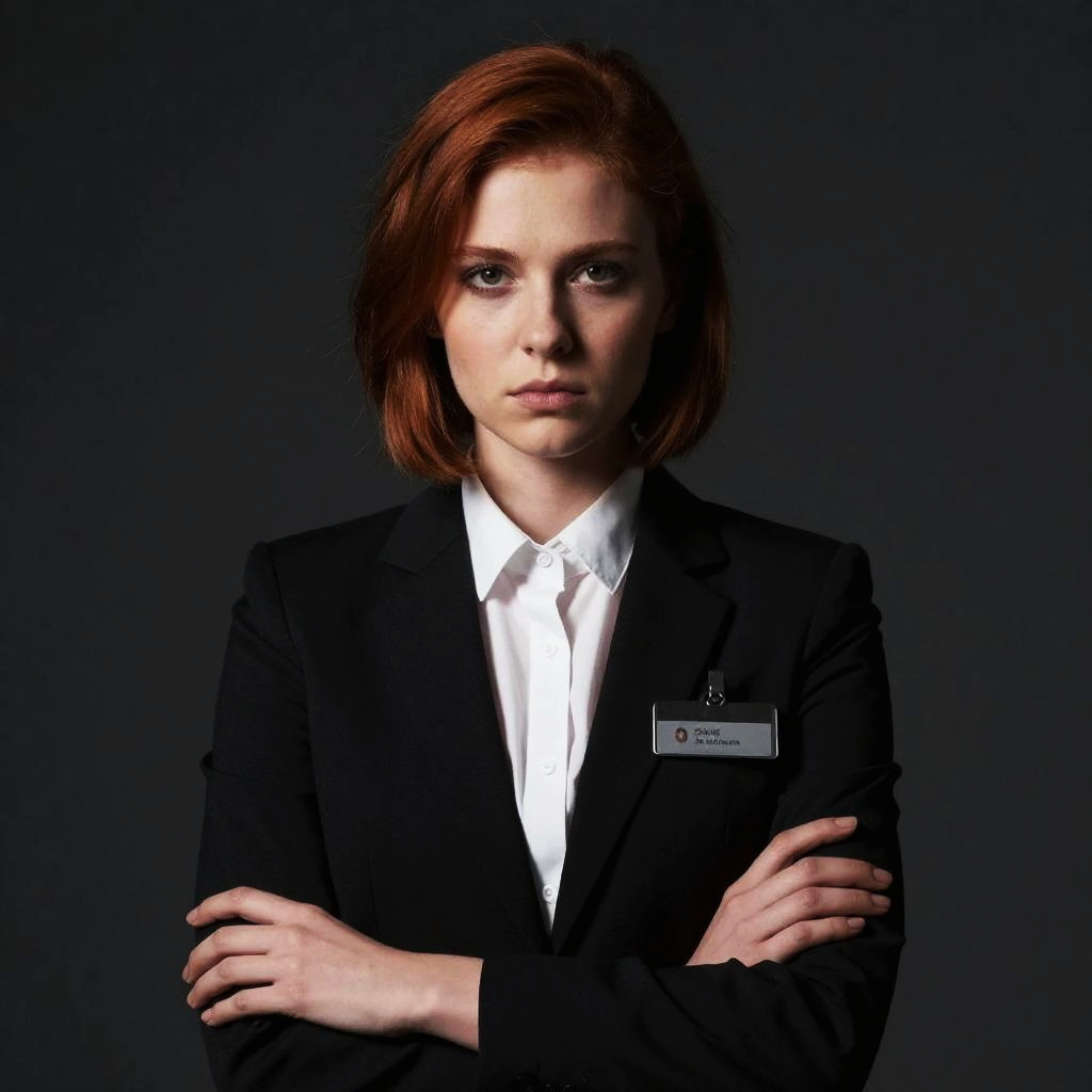 Photograph of a serious-looking woman with fair skin and straight, shoulder-length red hair, standing against a dark blue background. She wears a black blazer over a white dress shirt, with her arms crossed. A small name tag on the left side of her blazer reads "Ms. J." Her expression is stern, with direct eye contact. The lighting is focused on her face, creating a slight shadow behind her. The overall mood is professional and intense.
