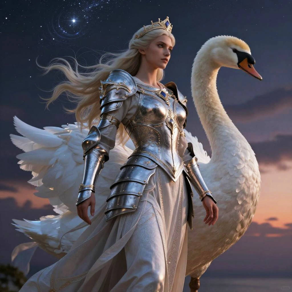 Leda depicted as a powerful figure in a fantasy realm, adorned with intricate armor and flowing robes, standing beside a majestic swan under a twilight sky filled with swirling stars, dramatic lighting emphasizing elegance and strength, digital art with attention to detail.
