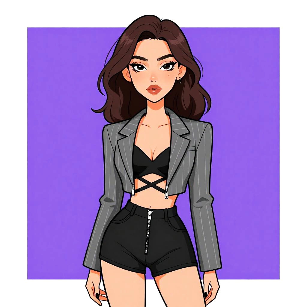 Woman with pretty face and pretty hair. Woman, edgy, textured stripe blazer in grey, asymmetrical zipper front, black strappy bodysuit underneath, form-fitting high-waisted black shorts, subtle makeup, loose wavy hair. --sref 1461