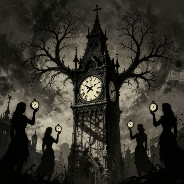 A hauntingly surreal digital illustration depicts an ancient clock tower with intricate fractal branches extending outward, casting shadowy silhouettes of figures holding miniature clocks, each frozen in a distinct moment of time, rendered in a moody, high-contrast style reminiscent of gothic fantasy art.