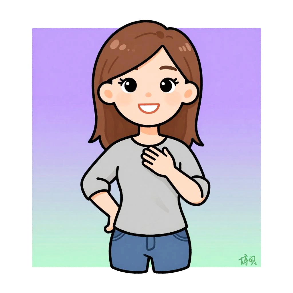 This is a digital cartoon-style drawing of a smiling woman with short brown hair, wearing a pink polo shirt and blue jeans. She's holding a flower pot with purple and white flowers in her right hand and a smartphone in her left. She has a light skin tone and is standing against a plain white background with gray borders on either side.