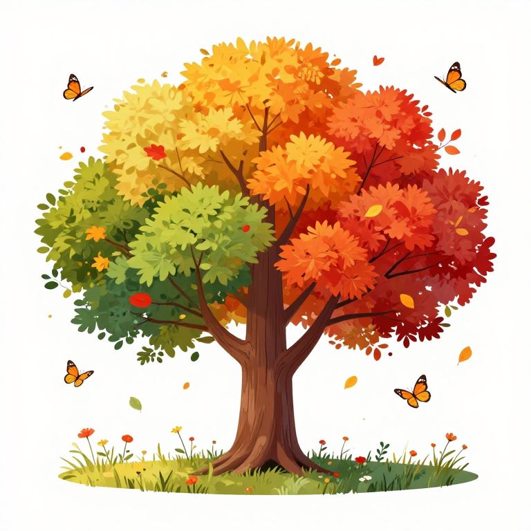 This vibrant digital illustration depicts a multi-colored tree with a sturdy brown trunk, displaying a gradient of autumn foliage from green on the left to yellow, orange, and red on the right. Small red leaves and orange flowers are scattered among the leaves. Two orange and black butterflies flutter around the tree, with some leaves appearing to fall. The background is white, highlighting the tree and its colorful leaves. The grass at the base is green with small orange flowers. The illustration style is bright, detailed, and cartoon-like, emphasizing the fall season.