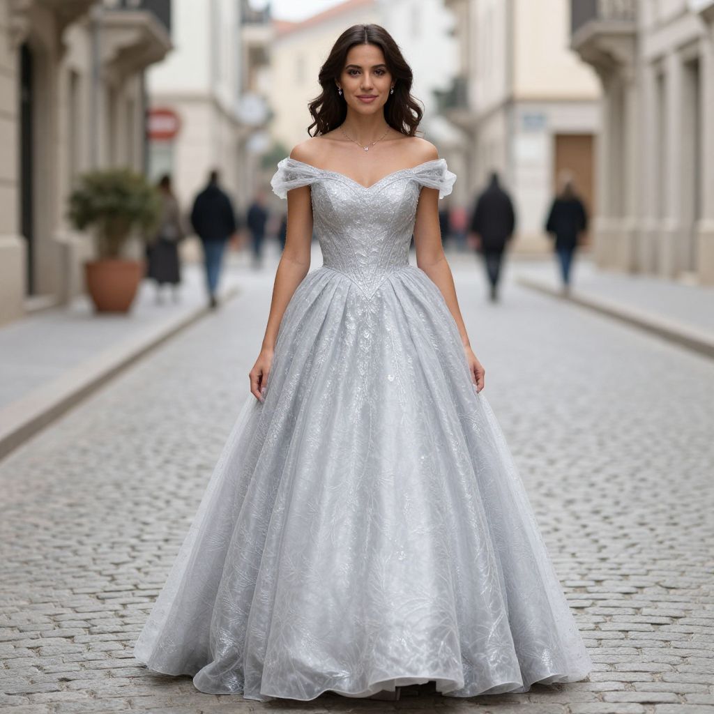 Beautiful Princess Dress, a woman in a silver dress standing on a cobblestone street