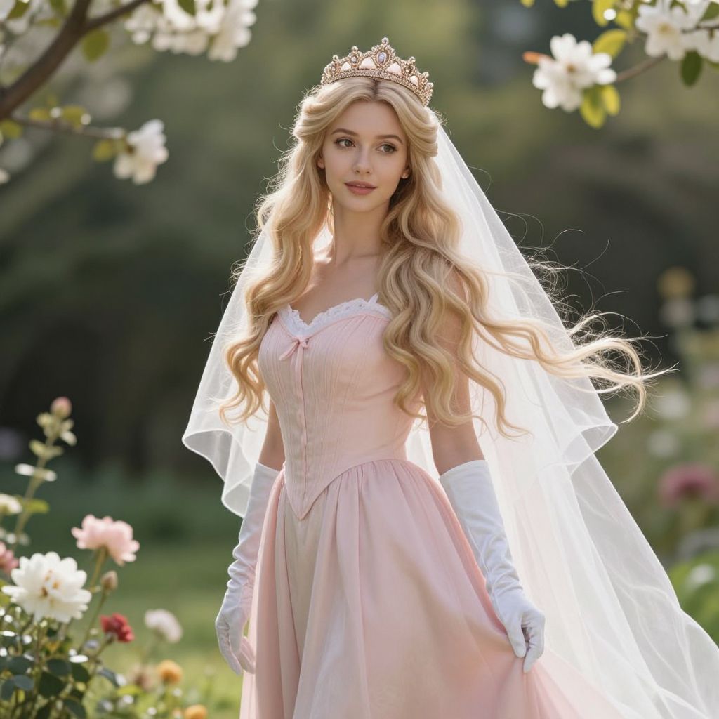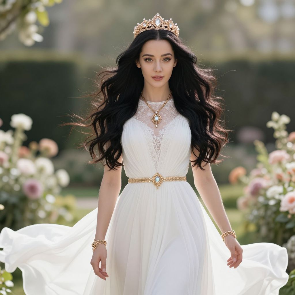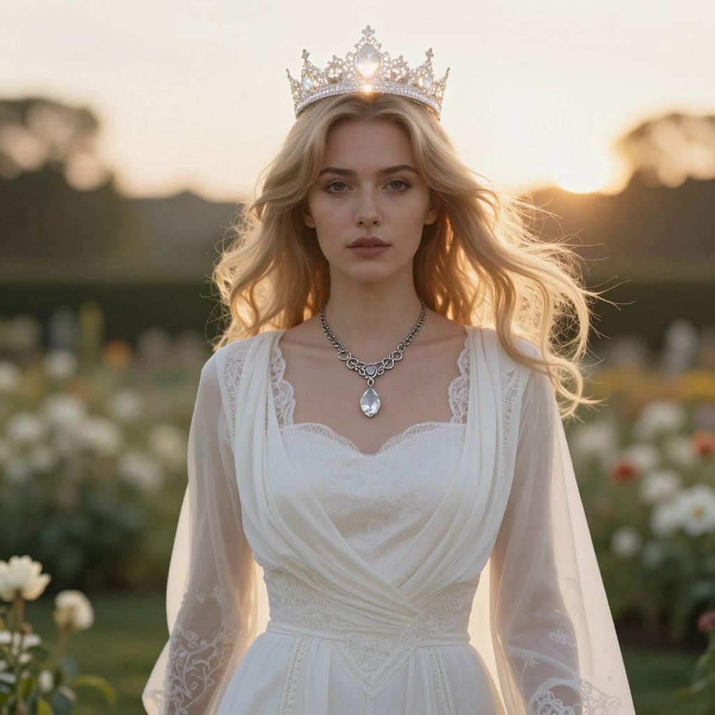 A beautiful young woman with soft, flowing blonde hair and gentle, serene eyes stands in a serene, sunlit garden. She wears a elegant white outfit that drapes beautifully over her form, with delicate lace detailing and a fitted bodice. A glowing white crown rests on her head, shimmering subtly with a soft golden light, symbolizing grace and nobility. Around her neck hangs a intricate silver necklace with a single crystal pendant that catches the sunlight, adding a touch of elegance and mystery. The background features blooming flowers and a warm, golden hour sky, enhancing the ethereal and majestic atmosphere.