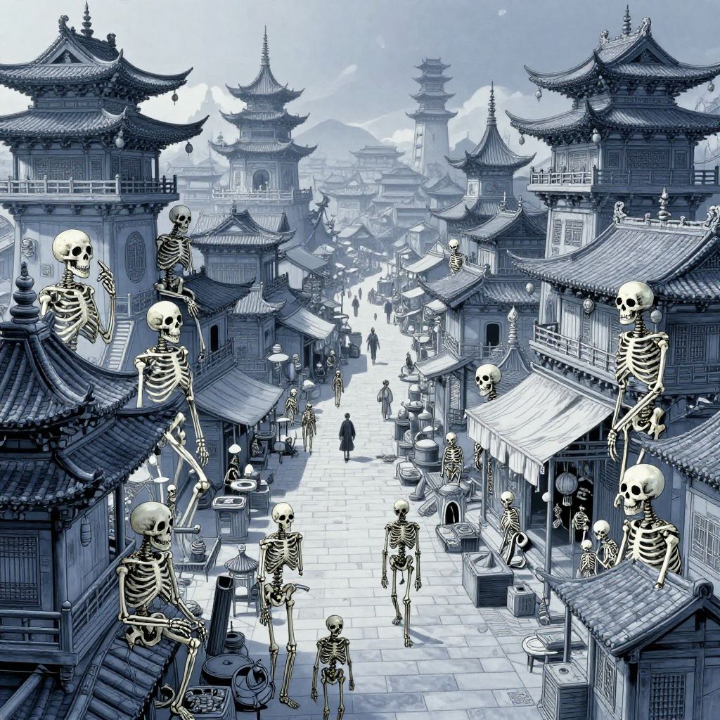 Digital artwork: Monochromatic blue street scene with skeletal figures on traditional Chinese buildings, people walking, and a distant pagoda. Skeletons atop roofs
