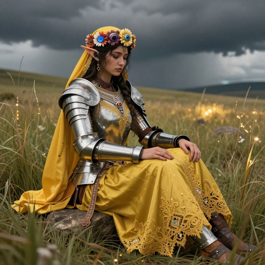 Photograph of a fair-skinned woman with dark hair and pointed elf-like ears, wearing a yellow lace dress and silver medieval armor with intricate designs. She sits in a grassy field under a dramatic, cloudy sky, adorned with a colorful flower crown. Her expression is serene, with one hand resting on her lap and the other on the ground. The yellow dress contrasts with the silver armor, and the field is dotted with small, glowing fairy lights. The background features rolling hills and a dark, ominous sky. The image has a fantasy, ethereal quality.