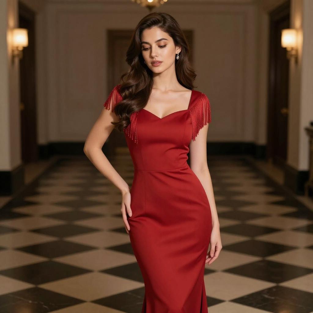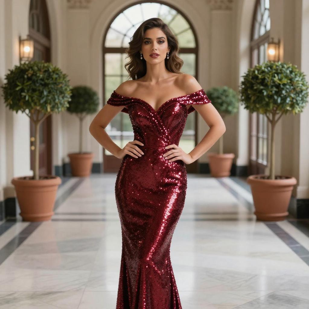 Photograph of a woman with long, wavy brown hair standing in an elegant, well-lit hallway. She wears a form-fitting, deep burgundy sequined gown with a V-neckline, accentuating her curvy figure. The hallway features white columns, polished marble floors, and warm, golden lighting from chandeliers. She stands confidently, looking slightly to the side.