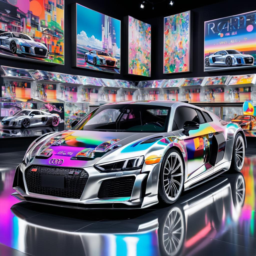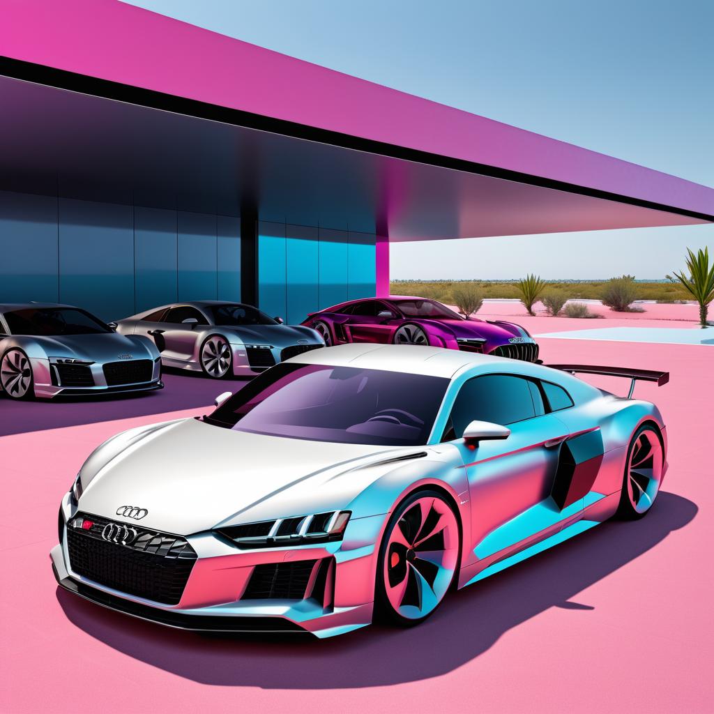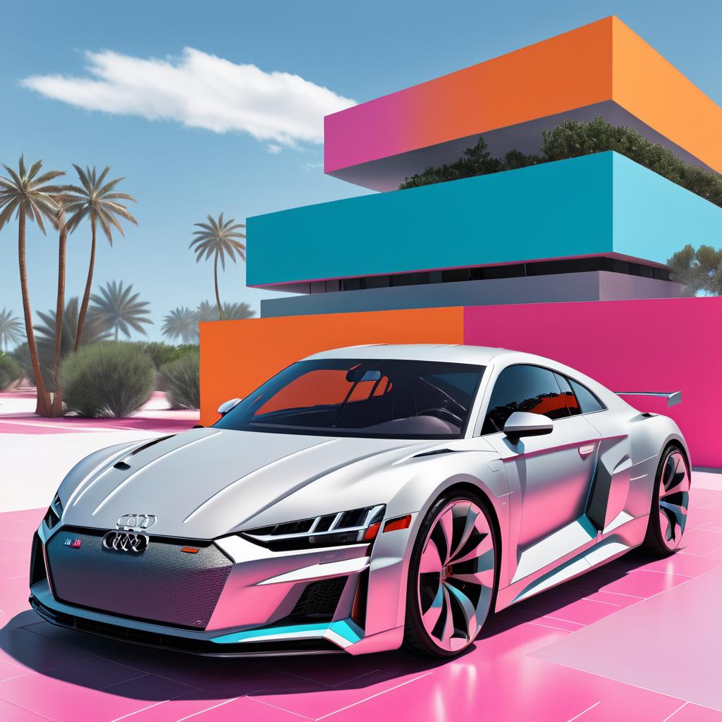 A sleek silver Audi sports car parked on a shiny pink tiled surface, featuring futuristic design elements and sharp lines. The background includes modern geometric buildings painted in bright orange, blue, and pink, with palm trees under a clear blue sky. The image combines automotive photography with comic cover art influences and vibrant color styling.