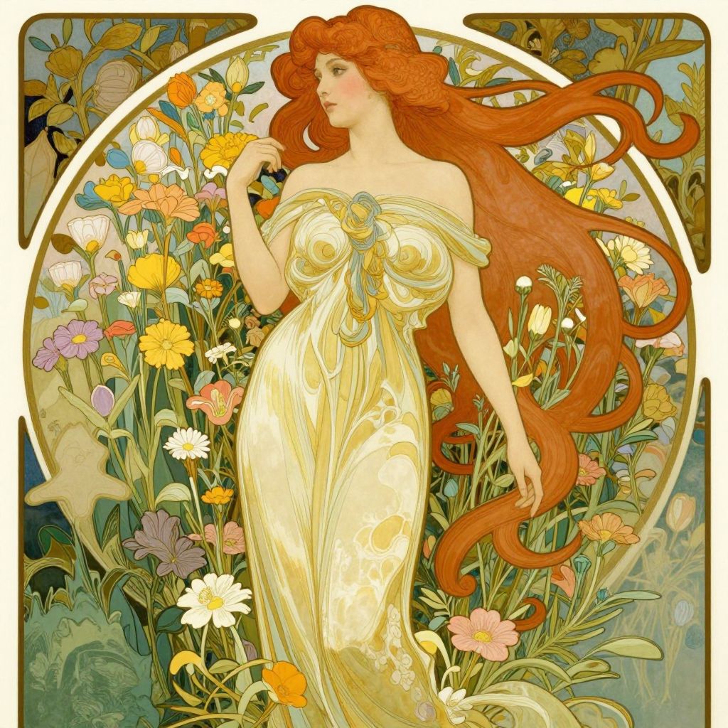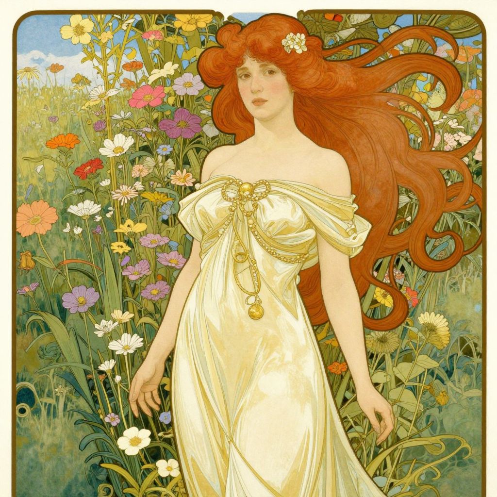 A vibrant digital illustration inspired by Alfons Mucha's \"The Seasons\" series, featuring a woman with flowing red hair standing amidst a lush field of colorful flowers, rendered in a detailed, hand-drawn style with soft, dreamy lighting effects.