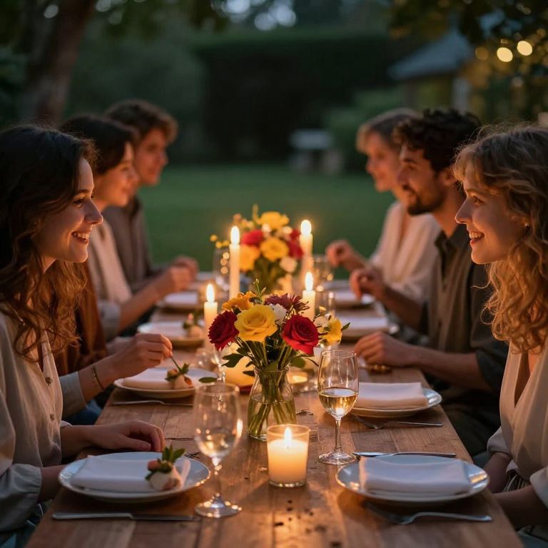 An intimate gathering bathed in the warmth of flickering candles and vibrant blooms, where the essence of celebration intertwines with the serenity of nature, evoking a timeless sense of joy and connection.