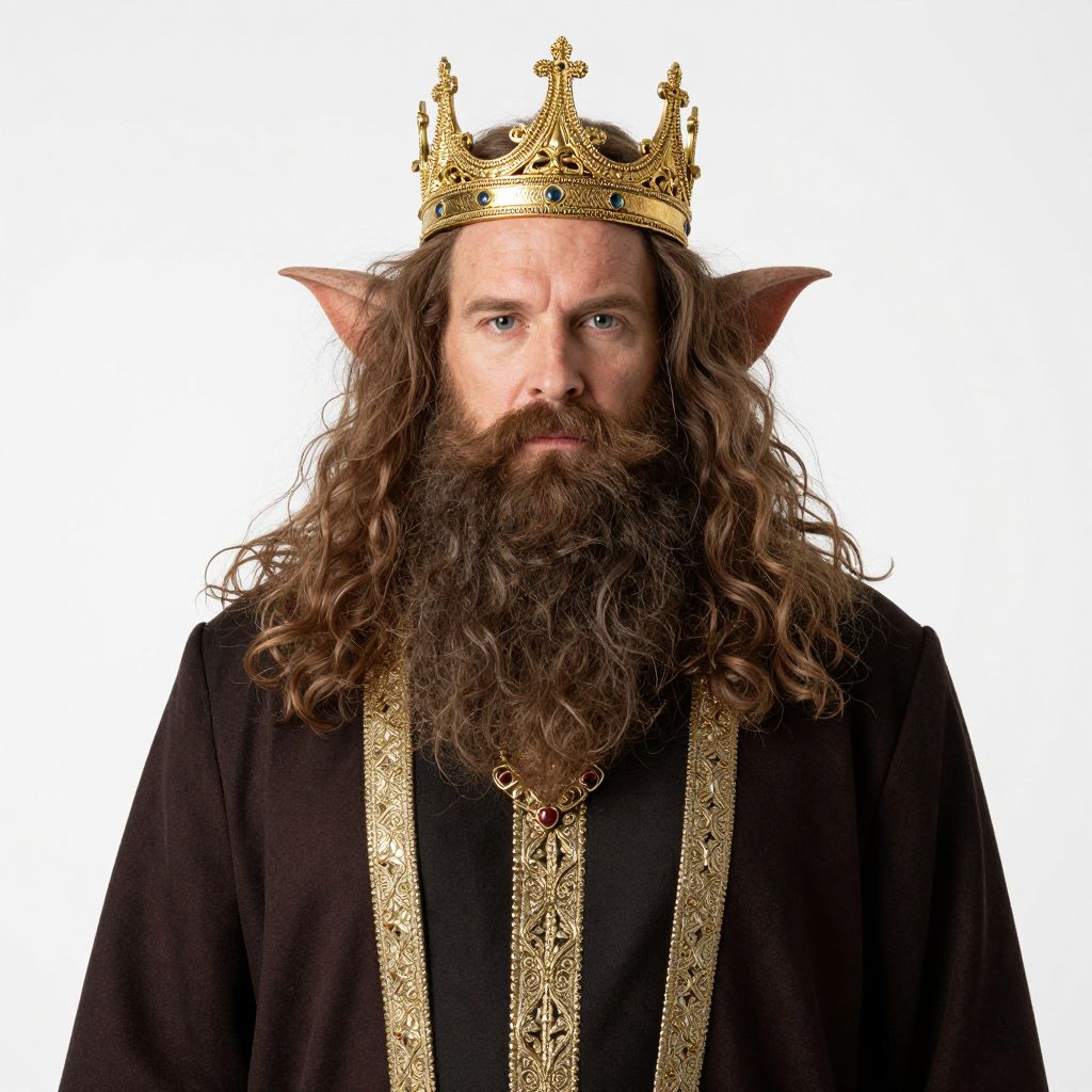 Photograph of a bearded man with long brown hair, elf ears, wearing a gold crown and black robe with gold trim, against a white background
