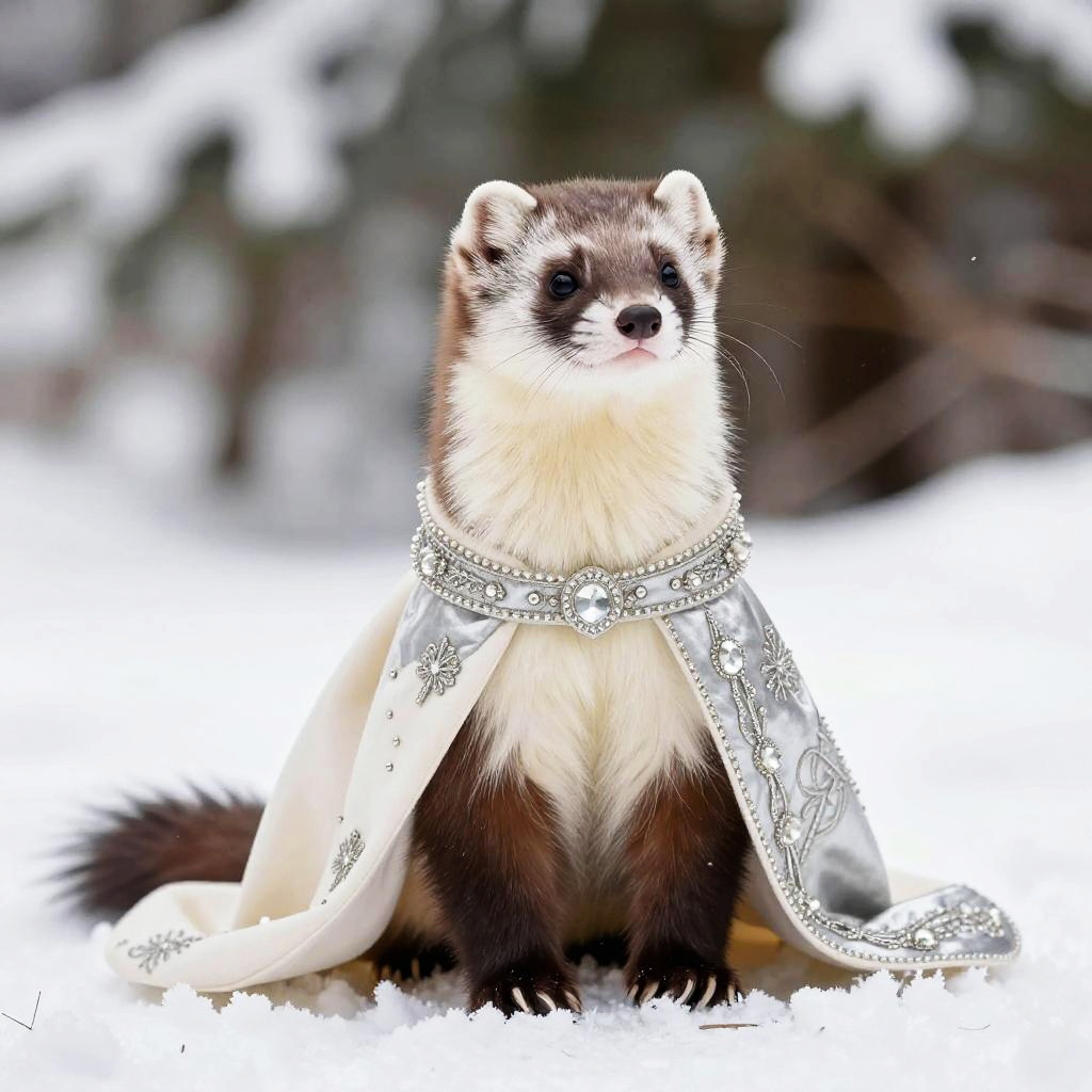 Elegant portrait of an ermine in an elegant cloak with colors ivory and silver against a snow covered glade background, showcasing its regal presence.