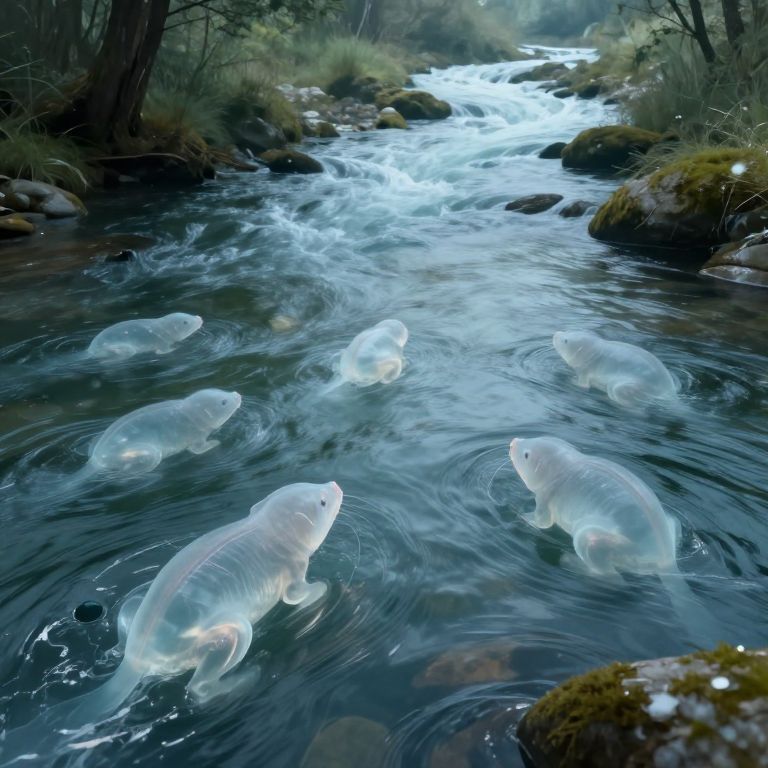 Photograph of a serene forest stream with six translucent white fish swimming in the clear, flowing water. The fish, with smooth, glowing bodies, are visible through the water, creating ripples. The stream is flanked by moss-covered rocks and surrounded by tall, dark green trees. Sunlight filters through the trees, casting a soft blue hue on the water and fish. The background shows a gentle, winding stream with small, white bubbles rising to the surface. The overall scene is tranquil and ethereal, blending natural elements with a dreamlike quality.