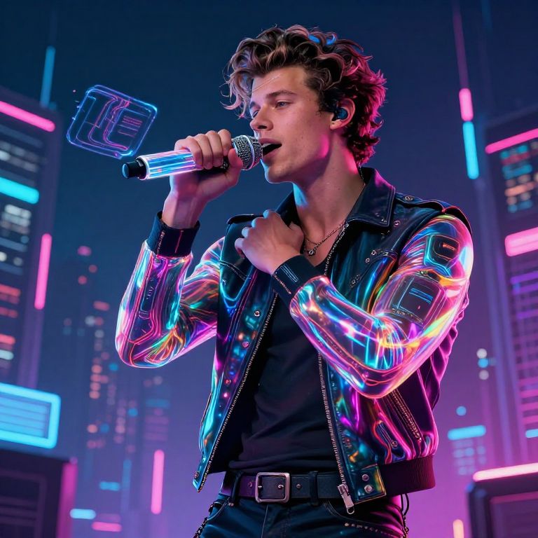 Shawn Mendes AI singing in a cyberpunk city, holographic microphone, vibrant neon reflections, dynamic pose, synthwave style, intricate tech details blending with natural elements