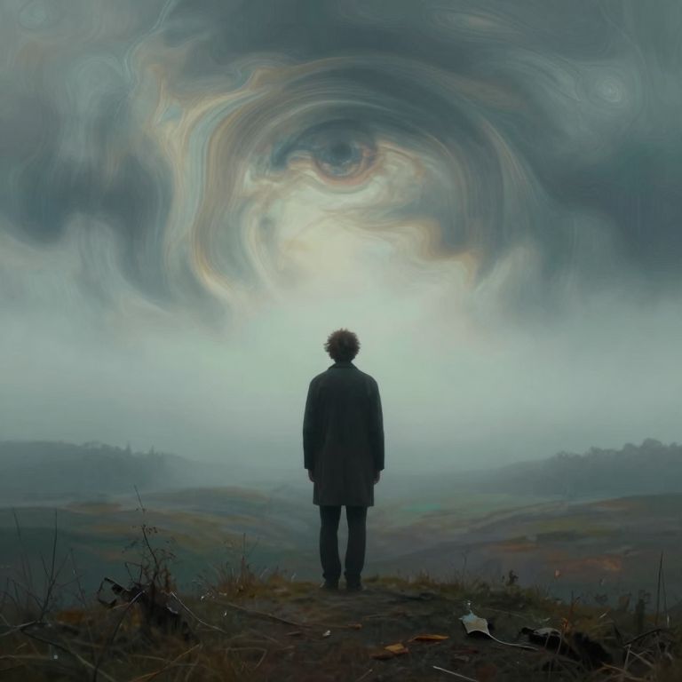 A solitary figure stands atop an expansive, desolate landscape, enveloped in an otherworldly mist that obscures their form. The scene is reminiscent of the striking realism and introspective atmosphere found in Edward Hopper's paintings, capturing a moment of profound solitude. The subject appears as a spectral presence, their silhouette casting elongated shadows across the barren terrain. As the viewer peers through the lens, they are drawn into this haunting tableau that combines the realism of the landscape with the enigmatic presence of the figure, evoking both awe and unease in equal measure.