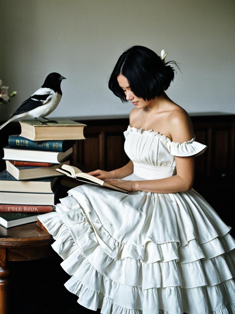 A young Asian woman with short black hair adorned with a white flower, wearing a strapless, white, multi-layered frilled dress, is sitting on the floor reading a book. Next to her is a wooden table with a tall stack of books and a black and white bird perched on top. The scene is set indoors against a plain light-colored wall.