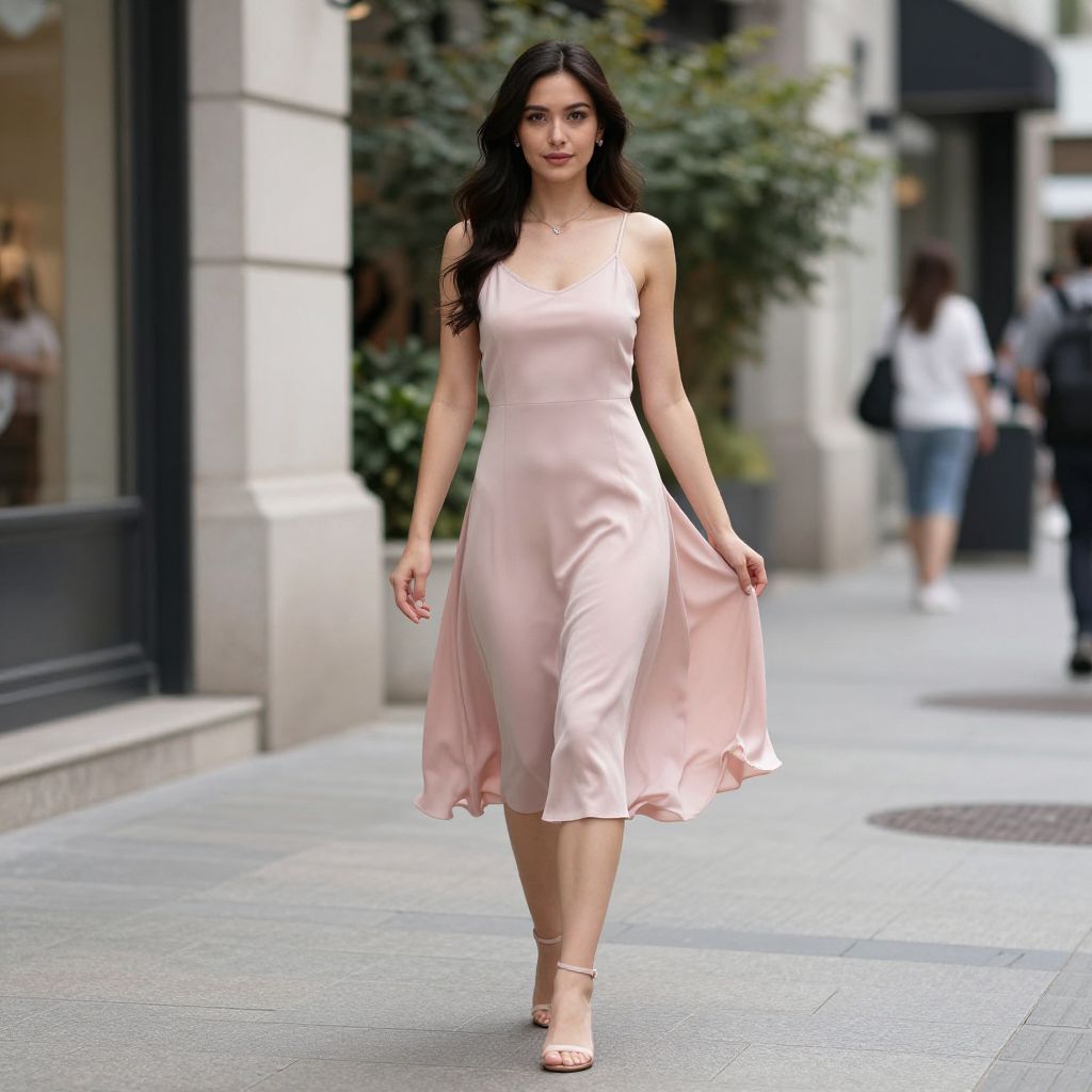 Photograph of an Asian woman with long black hair, wearing a pale pink, sleeveless dress and white sandals, walking confidently on a city sidewalk.