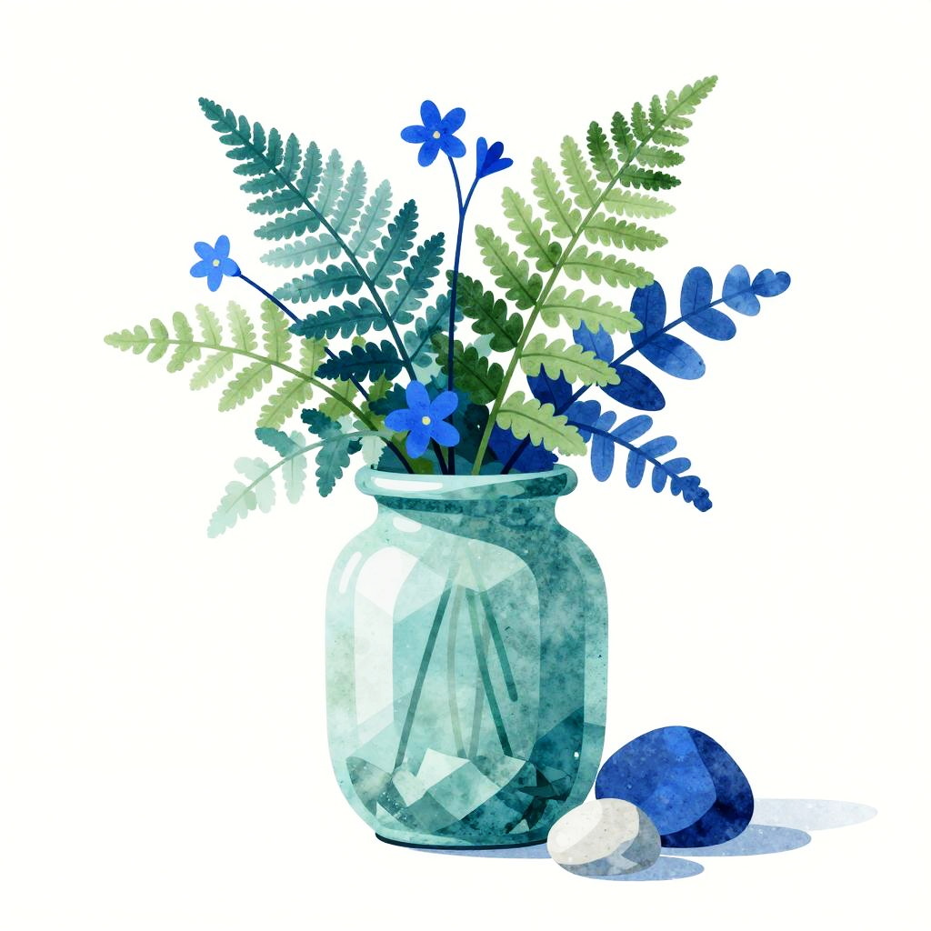 A Photorealistic pastel rendering with luminous shadows and glowing highlights of delphiniums in translucent amber bottles with adjacent cobalt ceramic bowls and mint green square pots. Set against irregular pastel brush dabs and faint chevron shapes in pale mint and peach on a tiled floor. Playful modern still life, Memphis-inspired geometry, saturated yet balanced color, clean negative space, high detail, crisp edges, soft studio lighting, cohesive composition.
