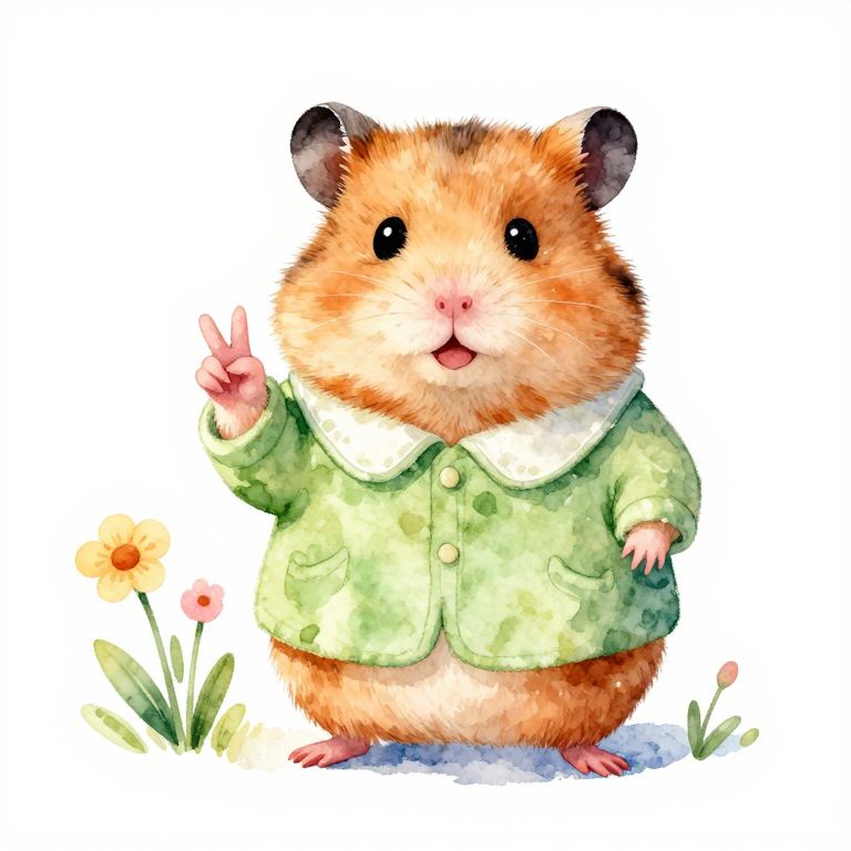 A colorful, whimsical watercolor illustration of an adorable hamster standing upright. The hamster has fluffy, orange-brown fur with black ears and large, round black eyes. It wears a light green, buttoned jacket with a white collar. The hamster's right paw is raised, making a peace sign with its fingers. In the background, two small flowers with yellow and orange petals grow from green grass. The illustration has a soft, gentle texture with delicate, flowing brushstrokes, creating a charming and playful atmosphere. The hamster's small pink nose and tiny, pink feet add to its cute appeal.