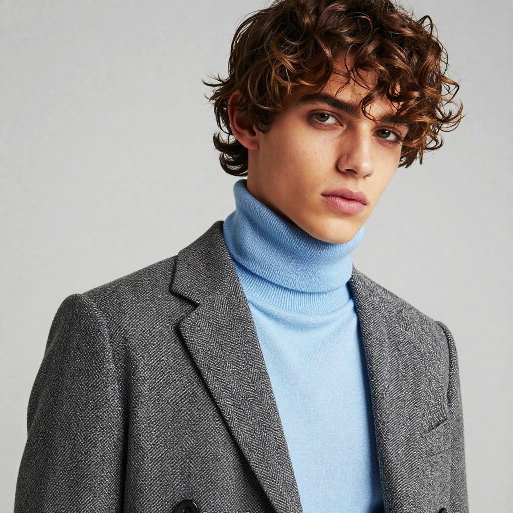 The image features a young man with a confident expression, wearing a stylish patterned blazer over a light blue turtleneck. His wavy hair and sharp gaze embody a modern, fashion-forward aesthetic, perfect for a variety of editorial and lifestyle contexts.