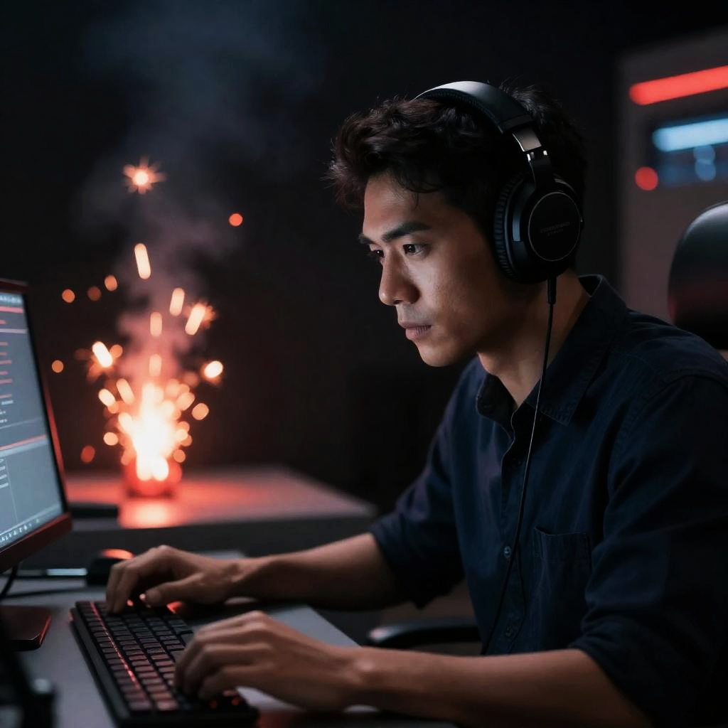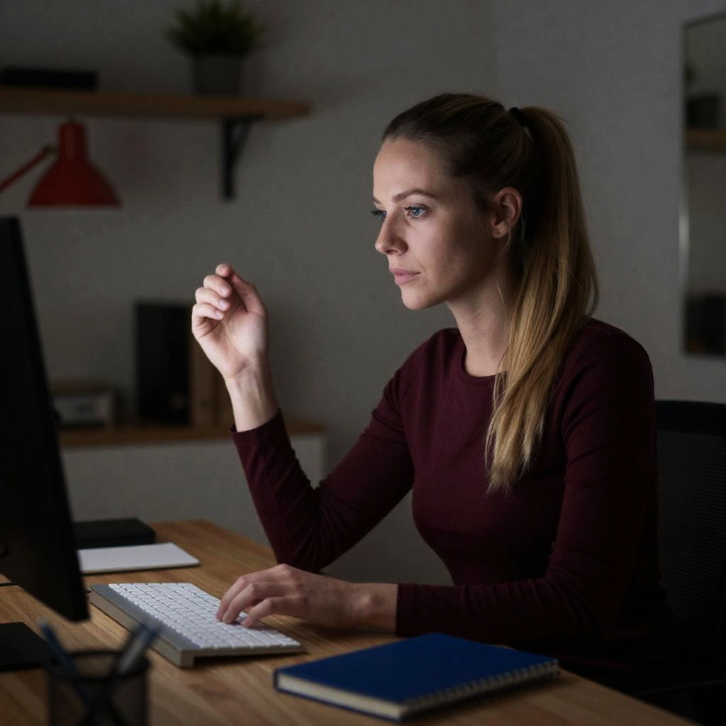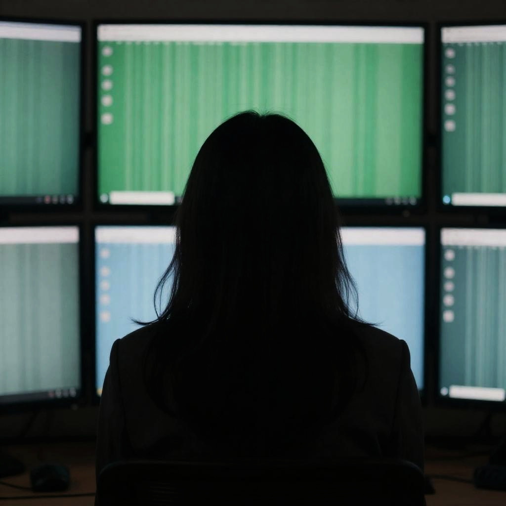 Blonde woman with curly hair and headset, wearing a black uniform, sits at a desk with multiple electronic control panels. She types on a keypad with red lights. Desk has a paper, a silver radio, and a bag of chips. Overhead view.
