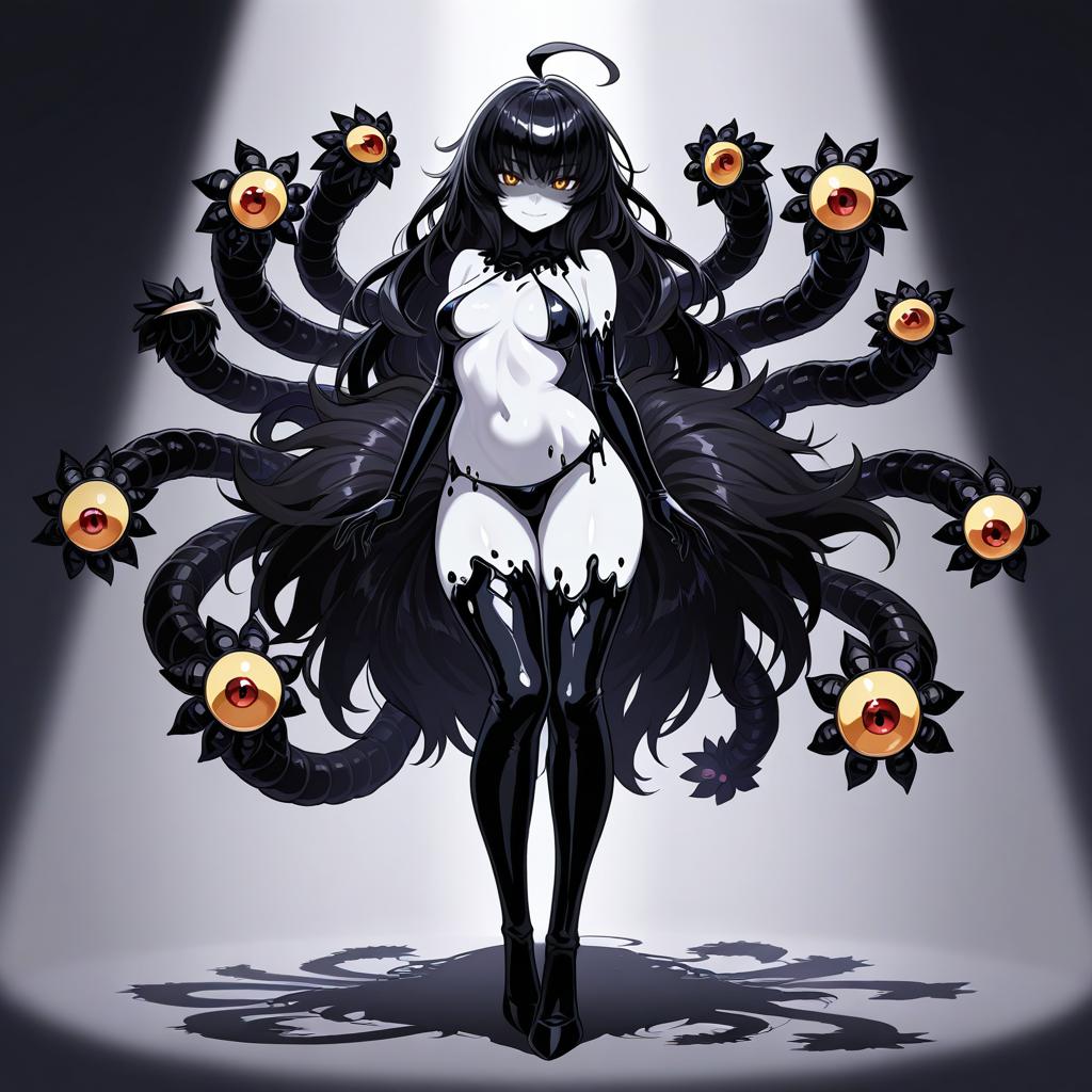 Digital artwork of a full-body original character inspired by the Gazer from Monster Girl Encyclopedia. The character is a petite, delicate, and stunningly beautiful female figure with volumetric lighting highlighting her. She has pale, colored skin with black glossy accents appearing like liquid covering her arms, legs, and parts of her torso. Her long black hair flows behind her, accompanied by multiple black tentacle-like appendages, each ending in a large, yellow eyeball with a red iris. The background features soft, shallow depth of field shadows emphasizing her detailed form.