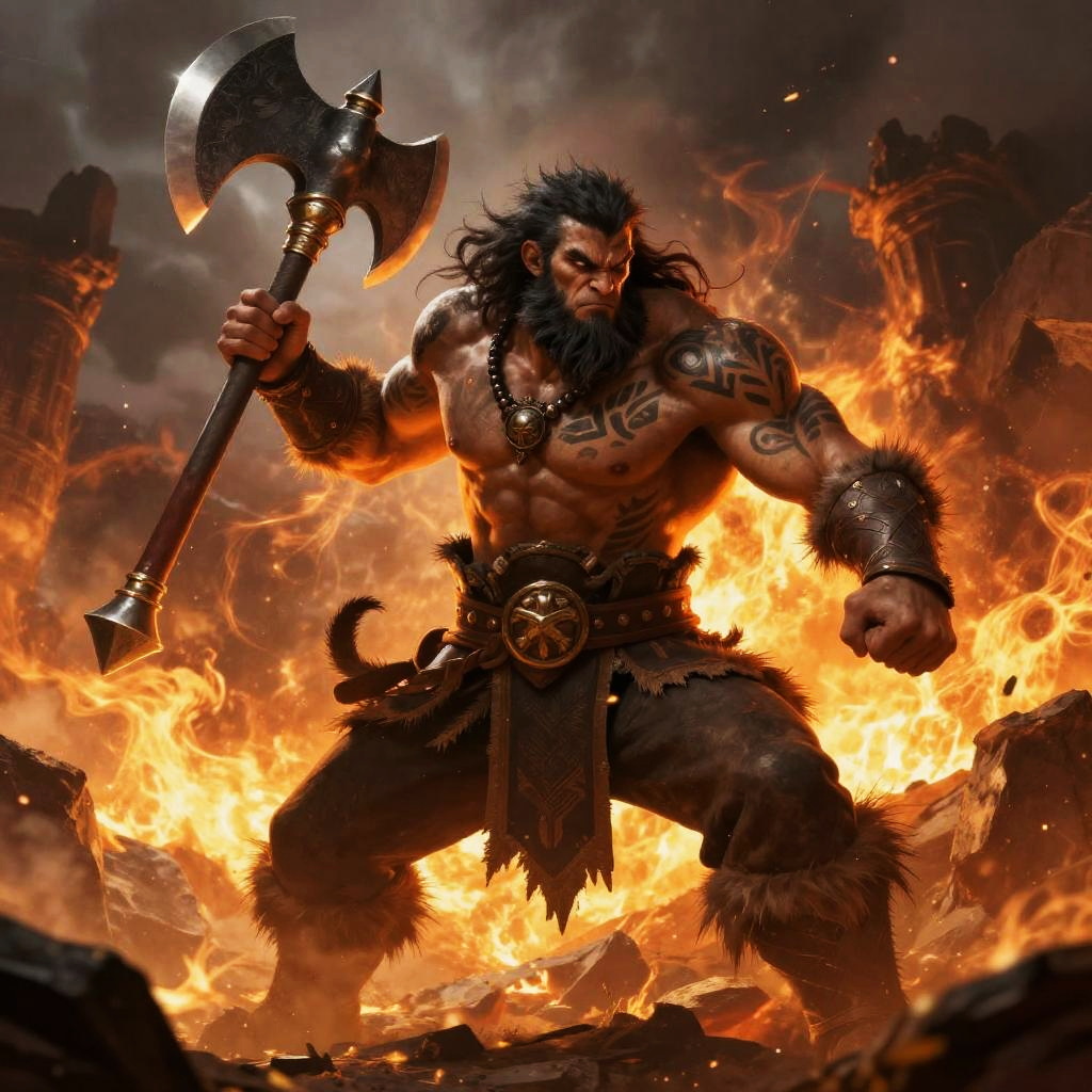 Dnd ai character generator producing a fierce barbarian warrior, muscular build, wielding a massive axe, tribal tattoos glowing faintly, fiery background, stormy skies, dynamic battle stance, vivid colors and detailed environment in fantasy style