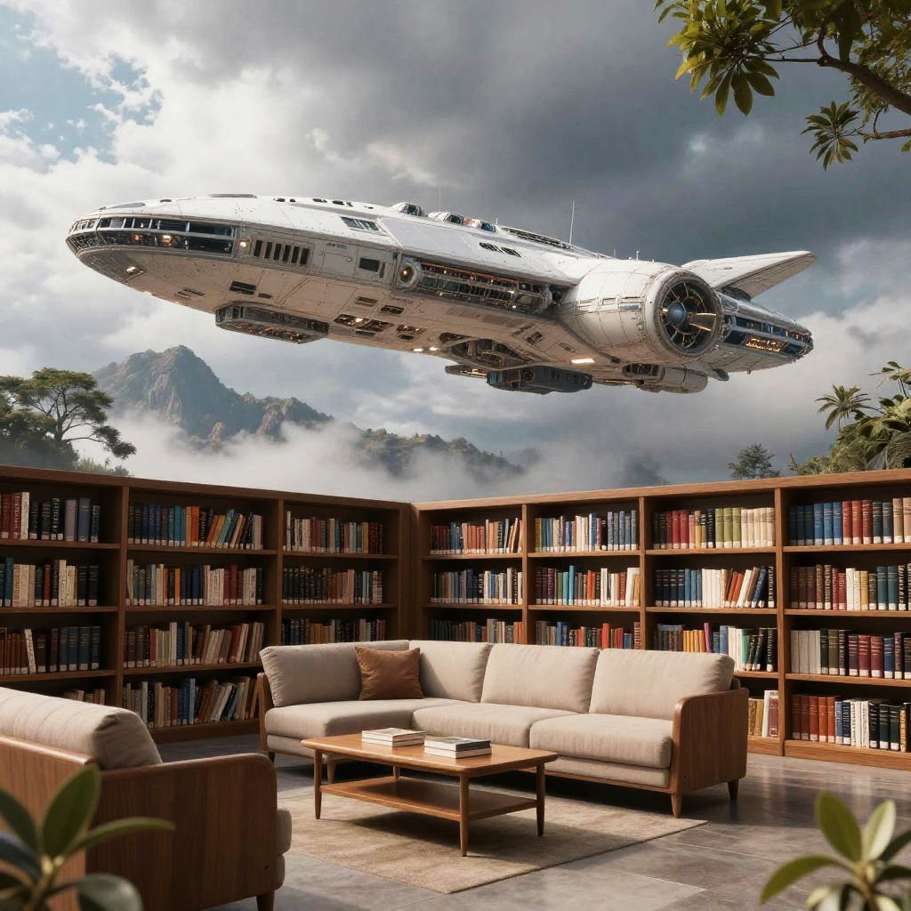A library with a sofa and book shelves, (masterpiece), (high quality), best quality, real, (realistic), super detailed, (full detail), (4k), 8k, spacecraft, scenery, cloud, science fiction, sky, fog, outdoors, mountain, cloudy sky, tree